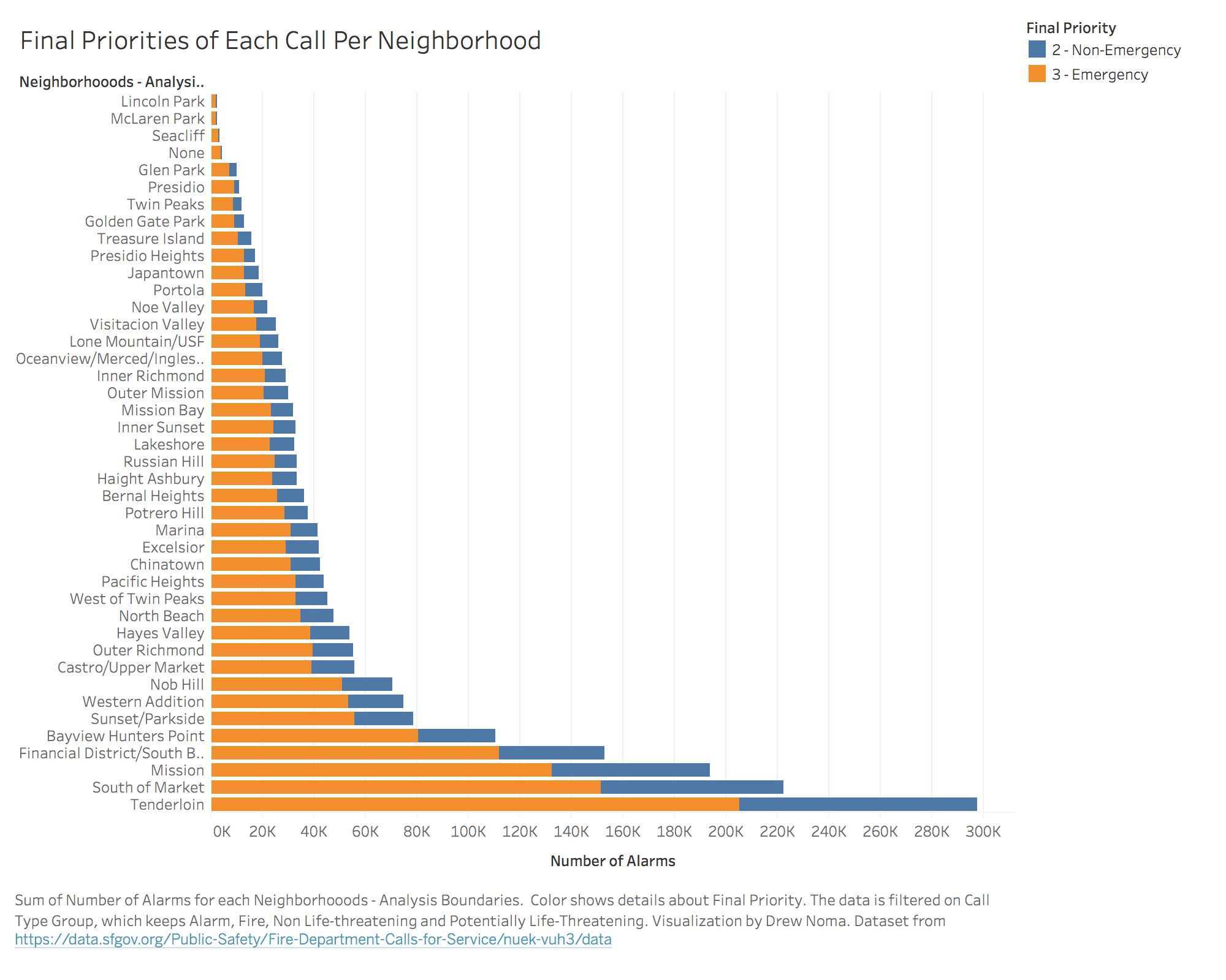 To give more context, another visualization is included to show the total number of calls and the Final Priorities of the calls from each neighborhood. The bars of each stack are encoded by color for Final Priority. The Final Priority is determined by the Fire Departments to say whether or not the call was actually an emergency or not. While people may report an emergency when calling in it is up to the Fire Departments to determine if the call is deemed an emergency or not.