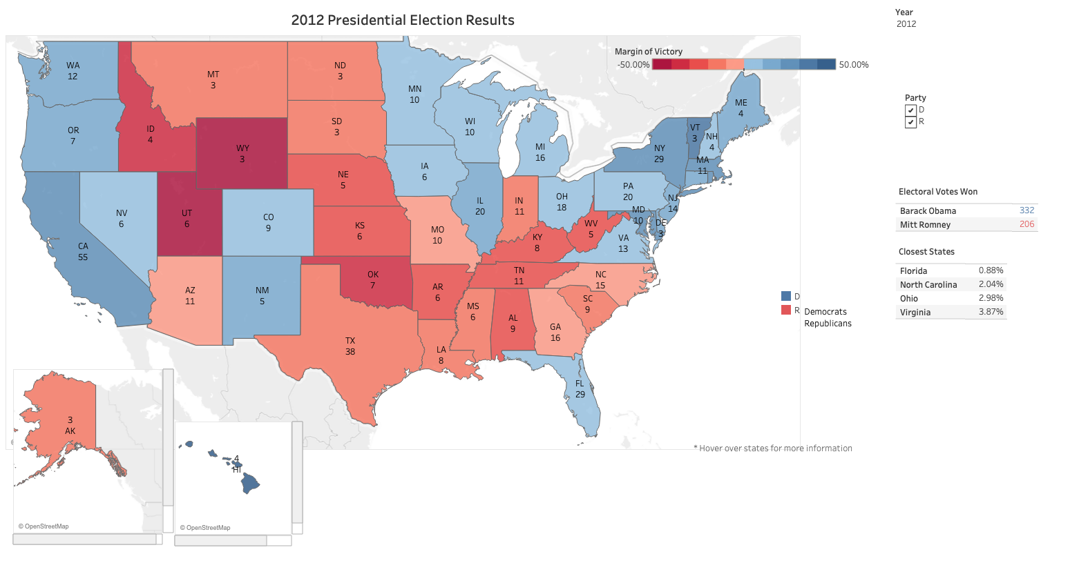 I built a geocoded electoral choropleth map in Tableau, using red for Republican states and blue for Democratic states. The depth of color also represents the margin of victory, the darker color means greater margin of victory.