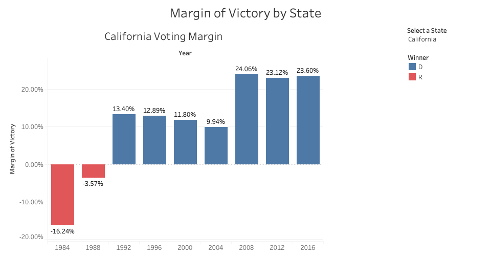 In below Diagram, except 1984(Ronald Reagan) and 1988(George HW Brush), CA is a uniformly Democrat.