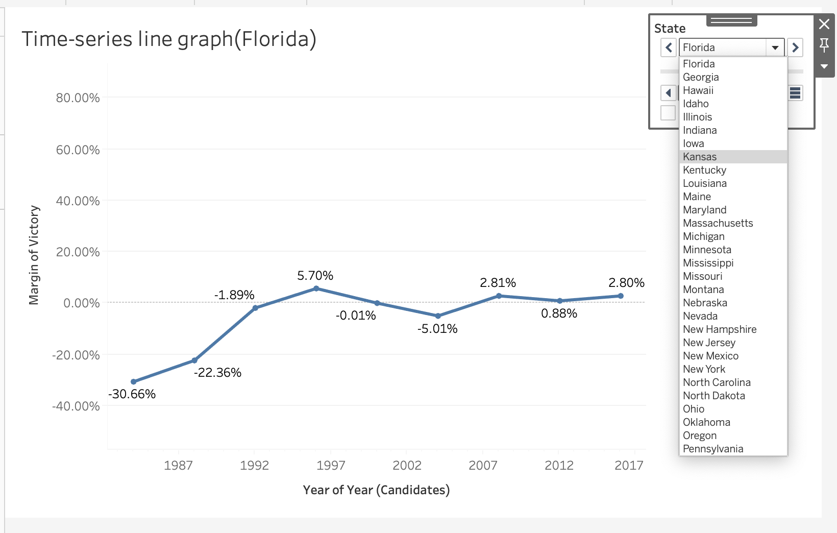 I built a geocoded electoral choropleth map in Tableau, using red for Republican states and blue for Democratic states. The depth of color also represents the margin of victory, the darker color means greater margin of victory.